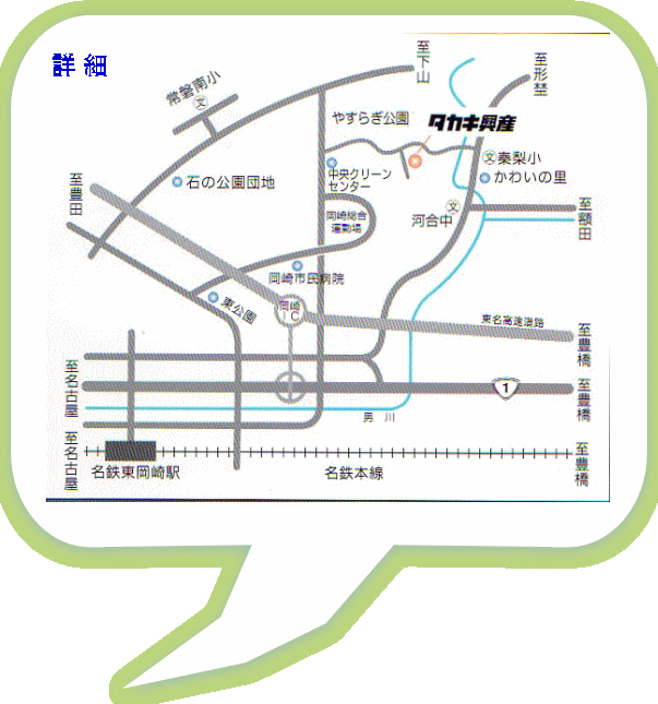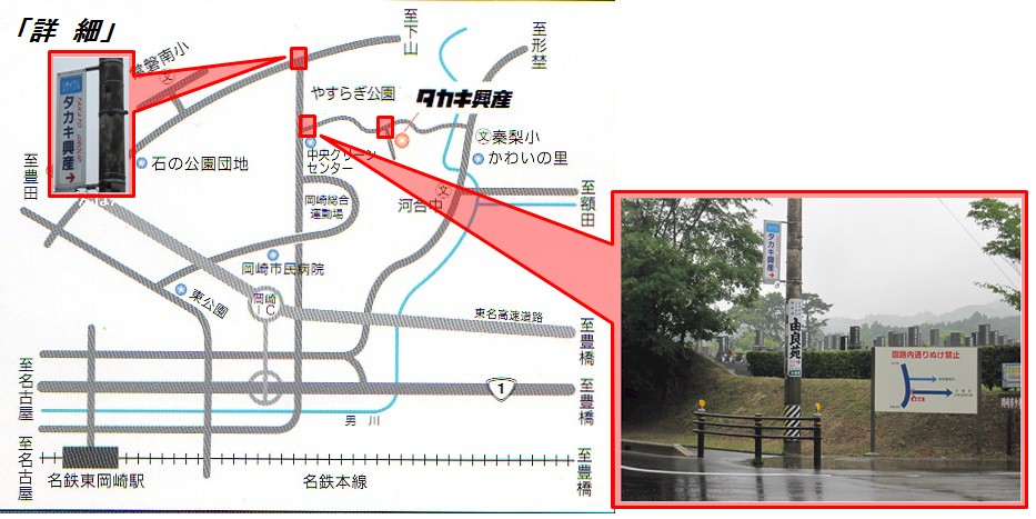 岡崎インターチェンジから約3km ※ ※インターから豊橋方面へ、大平町新寺交差点を左折、岡崎中央総合公園を右の見て道なりに直進、やすらぎ公園で右折300m。 * 注:各主要地点の電柱に案内かんばんがあります。