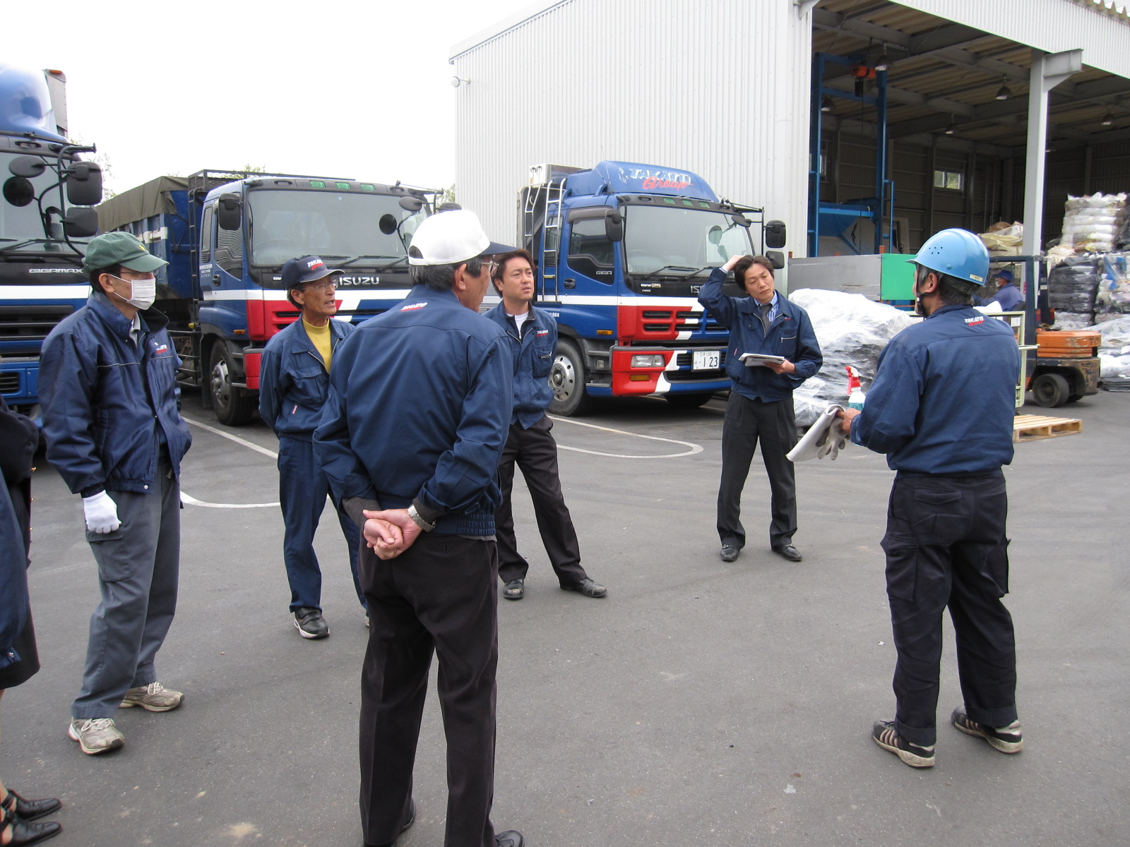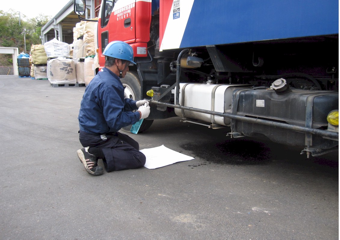 運搬中の産業廃棄物の飛散や流出、車両事故などを想定した訓練を実施しています。訓練ののテーマは、あらゆる可能性を皆で抽出して進めています。